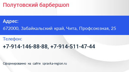 Полутовский, барбершоп по адресу 672000, Забайкальский край, Чита, Профсоюзная, 25 в дальнейшем Организация, размещена в следующих категориях: