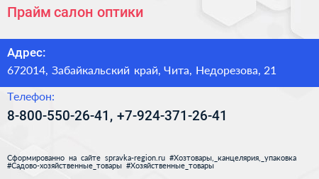 Прайм, салон оптики по адресу 672014, Забайкальский край, Чита, Недорезова, 21 в дальнейшем Организация, размещена в следующих категориях: