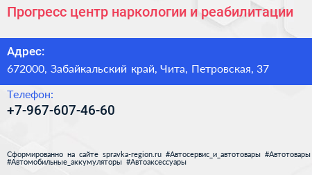 Прогресс, центр наркологии и реабилитации по адресу 672000, Забайкальский край, Чита, Петровская, 37 в дальнейшем Организация, размещена в следующих категориях: