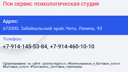 Пси-сервис, психологическая студия по адресу 672000, Забайкальский край, Чита, Ленина, 93 в дальнейшем Организация, размещена в следующих категориях: