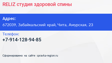 RELIZ, студия здоровой спины по адресу 672039, Забайкальский край, Чита, Амурская, 23 в дальнейшем Организация, размещена в следующих категориях: