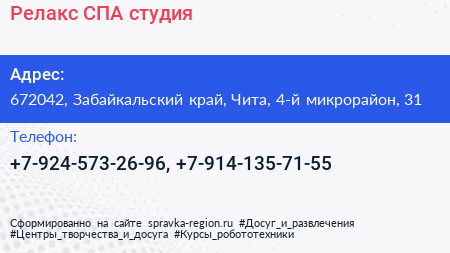 Релакс, СПА-студия по адресу 672042, Забайкальский край, Чита, 4-й микрорайон, 31 в дальнейшем Организация, размещена в следующих категориях: