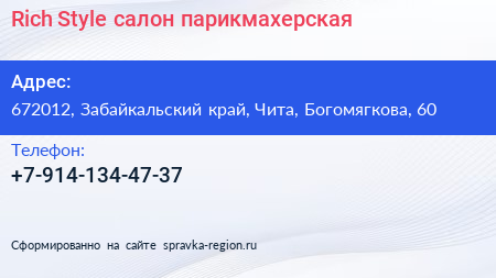 Rich Style, салон-парикмахерская по адресу 672012, Забайкальский край, Чита, Богомягкова, 60 в дальнейшем Организация, размещена в следующих категориях: