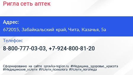 Ригла, сеть аптек по адресу 672015, Забайкальский край, Чита, Казачья, 5а в дальнейшем Организация, размещена в следующих категориях: