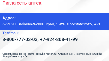 Ригла, сеть аптек по адресу 672020, Забайкальский край, Чита, Ярославского, 49а в дальнейшем Организация, размещена в следующих категориях: