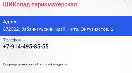 ШИКолад, парикмахерская по адресу 672022, Забайкальский край, Чита, Энтузиастов, 1 в дальнейшем Организация, размещена в следующих категориях: