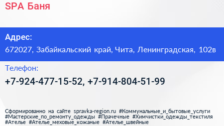 SPA Баня по адресу 672027, Забайкальский край, Чита, Ленинградская, 102в в дальнейшем Организация, размещена в следующих категориях: