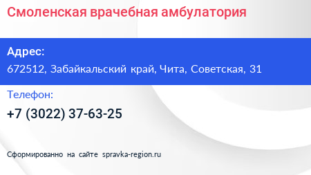 Смоленская врачебная амбулатория по адресу 672512, Забайкальский край, Чита, Советская, 31 в дальнейшем Организация, размещена в следующих категориях: