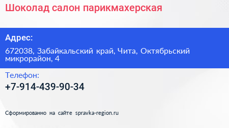 Шоколад, салон-парикмахерская по адресу 672038, Забайкальский край, Чита, Октябрьский микрорайон, 4 в дальнейшем Организация, размещена в следующих категориях: