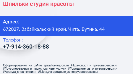 Шпильки, студия красоты по адресу 672027, Забайкальский край, Чита, Бутина, 44 в дальнейшем Организация, размещена в следующих категориях: