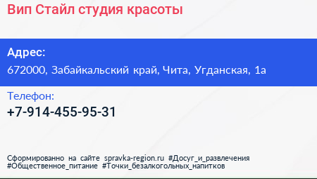 Вип Стайл, студия красоты по адресу 672000, Забайкальский край, Чита, Угданская, 1а в дальнейшем Организация, размещена в следующих категориях: