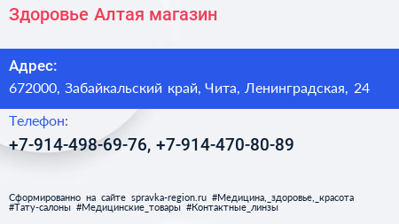 Здоровье Алтая, магазин по адресу 672000, Забайкальский край, Чита, Ленинградская, 24 в дальнейшем Организация, размещена в следующих категориях: