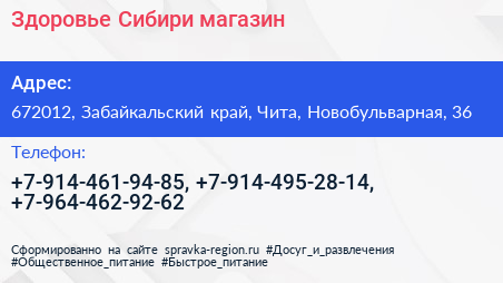 Здоровье Сибири, магазин по адресу 672012, Забайкальский край, Чита, Новобульварная, 36 в дальнейшем Организация, размещена в следующих категориях: