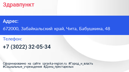 Здравпункт по адресу 672000, Забайкальский край, Чита, Бабушкина, 48 в дальнейшем Организация, размещена в следующих категориях:
