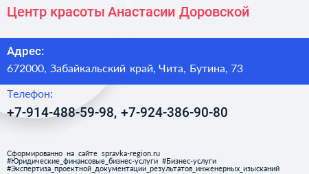Центр красоты Анастасии Доровской по адресу 672000, Забайкальский край, Чита, Бутина, 73 в дальнейшем Организация, размещена в следующих категориях: