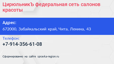 ЦирюльникЪ, федеральная сеть салонов красоты по адресу 672000, Забайкальский край, Чита, Ленина, 43 в дальнейшем Организация, размещена в следующих категориях: