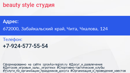 beauty style, студия по адресу 672000, Забайкальский край, Чита, Чкалова, 124 в дальнейшем Организация, размещена в следующих категориях: