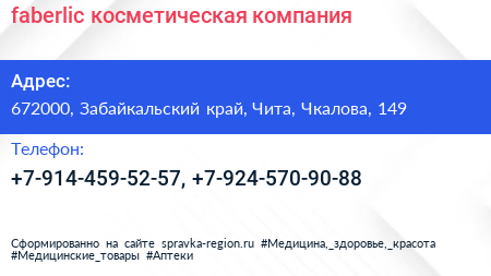 faberlic, косметическая компания по адресу 672000, Забайкальский край, Чита, Чкалова, 149 в дальнейшем Организация, размещена в следующих категориях: