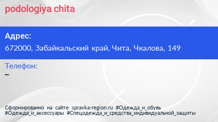 podologiya.chita по адресу 672000, Забайкальский край, Чита, Чкалова, 149 в дальнейшем Организация, размещена в следующих категориях: