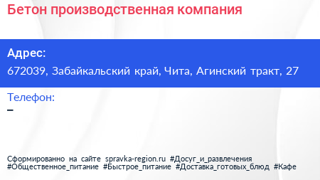Бетон, производственная компания по адресу 672039, Забайкальский край, Чита, Агинский тракт, 27 в дальнейшем Организация, размещена в следующих категориях: