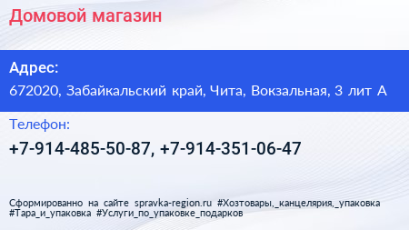 Домовой, магазин по адресу 672020, Забайкальский край, Чита, Вокзальная, 3 лит А в дальнейшем Организация, размещена в следующих категориях: