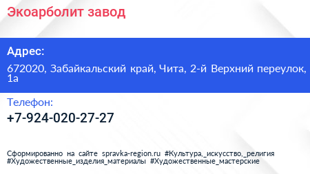Экоарболит, завод по адресу 672020, Забайкальский край, Чита, 2-й Верхний переулок, 1а в дальнейшем Организация, размещена в следующих категориях: