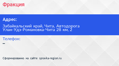 Фракция по адресу Забайкальский край, Чита, Автодорога Улан-Удэ-Романовка-Чита 28 км, 2 в дальнейшем Организация, размещена в следующих категориях: