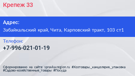 Крепеж 33 по адресу Забайкальский край, Чита, Карповский тракт, 103 ст1 в дальнейшем Организация, размещена в следующих категориях: