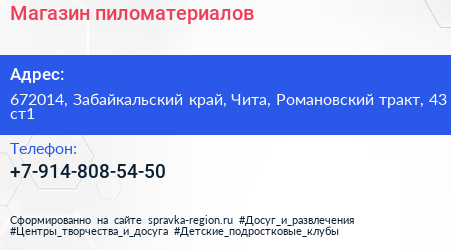 Магазин пиломатериалов по адресу 672014, Забайкальский край, Чита, Романовский тракт, 43 ст1 в дальнейшем Организация, размещена в следующих категориях: