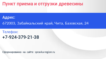 Пункт приема и отгрузки древесины по адресу 672003, Забайкальский край, Чита, Базовская, 24 в дальнейшем Организация, размещена в следующих категориях: