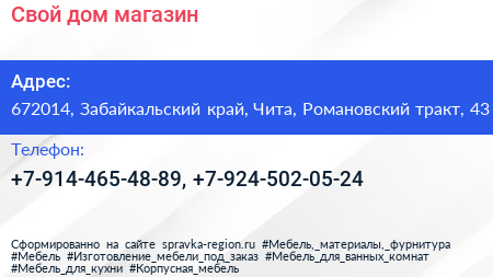 Свой дом, магазин по адресу 672014, Забайкальский край, Чита, Романовский тракт, 43 в дальнейшем Организация, размещена в следующих категориях: