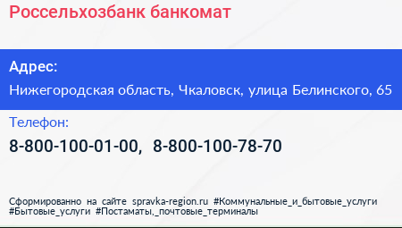Россельхозбанк, банкомат по адресу Нижегородская область, Чкаловск, улица Белинского, 65 в дальнейшем Организация, размещена в следующих категориях:
