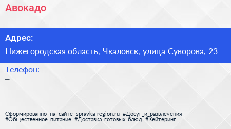 Авокадо по адресу Нижегородская область, Чкаловск, улица Суворова, 23 в дальнейшем Организация, размещена в следующих категориях: