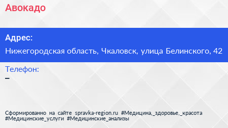 Авокадо по адресу Нижегородская область, Чкаловск, улица Белинского, 42 в дальнейшем Организация, размещена в следующих категориях: