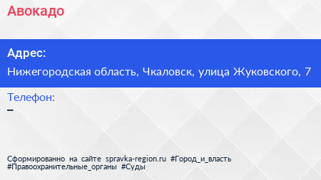Авокадо по адресу Нижегородская область, Чкаловск, улица Жуковского, 7 в дальнейшем Организация, размещена в следующих категориях: