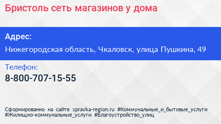 Бристоль, сеть магазинов у дома по адресу Нижегородская область, Чкаловск, улица Пушкина, 49 в дальнейшем Организация, размещена в следующих категориях: