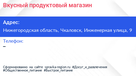 Вкусный, продуктовый магазин по адресу Нижегородская область, Чкаловск, Инженерная улица, 9 в дальнейшем Организация, размещена в следующих категориях: