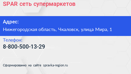 SPAR, сеть супермаркетов по адресу Нижегородская область, Чкаловск, улица Мира, 1 в дальнейшем Организация, размещена в следующих категориях: