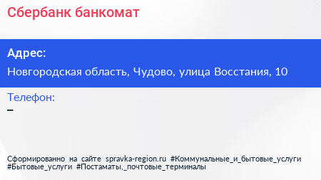 Сбербанк, банкомат по адресу Новгородская область, Чудово, улица Восстания, 10 в дальнейшем Организация, размещена в следующих категориях: