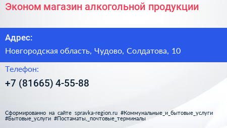 Эконом, магазин алкогольной продукции по адресу Новгородская область, Чудово, Солдатова, 10 в дальнейшем Организация, размещена в следующих категориях: