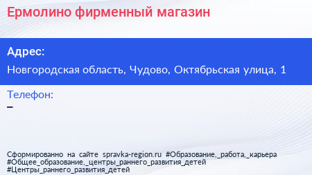 Ермолино, фирменный магазин по адресу Новгородская область, Чудово, Октябрьская улица, 1 в дальнейшем Организация, размещена в следующих категориях: