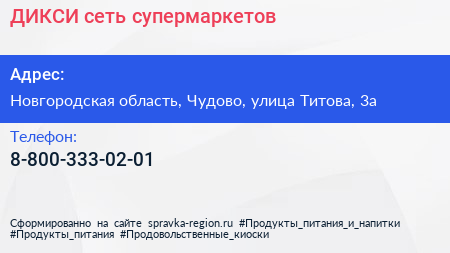 ДИКСИ, сеть супермаркетов по адресу Новгородская область, Чудово, улица Титова, 3а в дальнейшем Организация, размещена в следующих категориях: