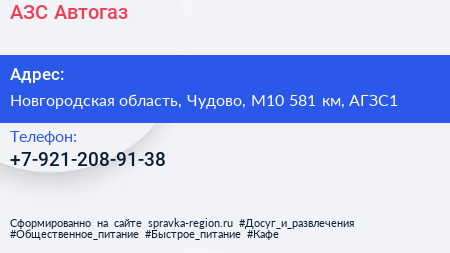 АЗС, Автогаз по адресу Новгородская область, Чудово, М10 581 км, АГЗС1 в дальнейшем Организация, размещена в следующих категориях: