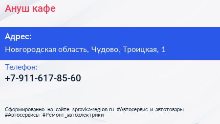 Ануш, кафе по адресу Новгородская область, Чудово, Троицкая, 1 в дальнейшем Организация, размещена в следующих категориях: