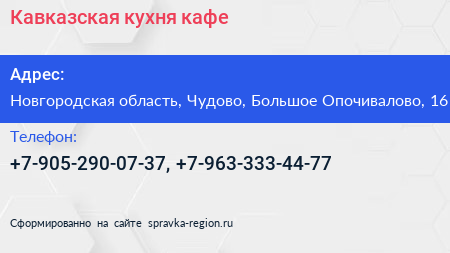 Кавказская кухня, кафе по адресу Новгородская область, Чудово, Большое Опочивалово, 16 в дальнейшем Организация, размещена в следующих категориях: