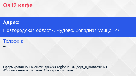 Osll2, кафе по адресу Новгородская область, Чудово, Западная улица, 27 в дальнейшем Организация, размещена в следующих категориях: