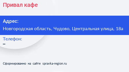 Привал, кафе по адресу Новгородская область, Чудово, Центральная улица, 18а в дальнейшем Организация, размещена в следующих категориях: