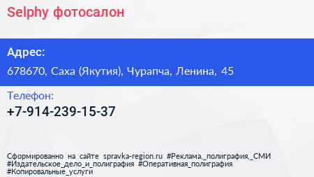 Selphy, фотосалон по адресу 678670, Саха (Якутия), Чурапча, Ленина, 45 в дальнейшем Организация, размещена в следующих категориях: