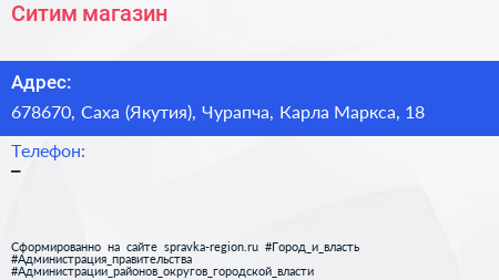Ситим, магазин по адресу 678670, Саха (Якутия), Чурапча, Карла Маркса, 18 в дальнейшем Организация, размещена в следующих категориях: