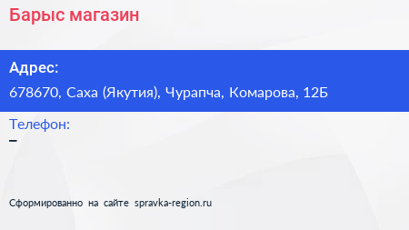 Барыс, магазин по адресу 678670, Саха (Якутия), Чурапча, Комарова, 12Б в дальнейшем Организация, размещена в следующих категориях:
